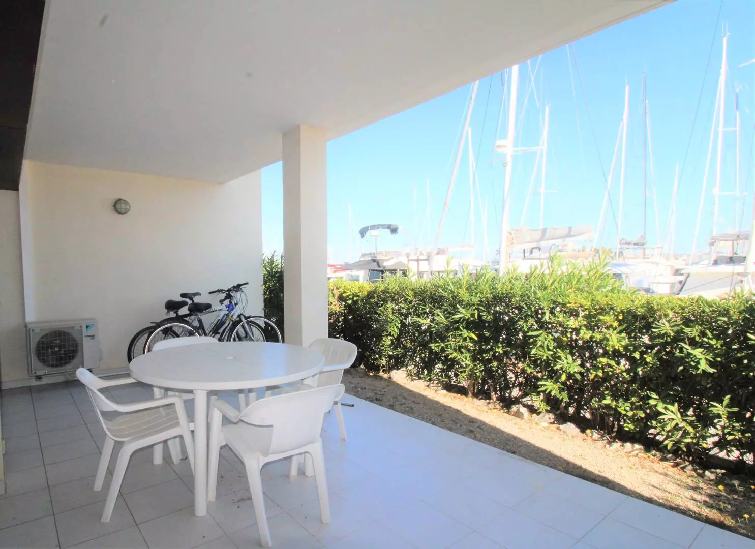The living room and bedroom open onto a large southwest-facing terrace, ideal for enjoying al fresco dining, offering breathtaking views of the Marina and the Gulf of Saint-Tropez.