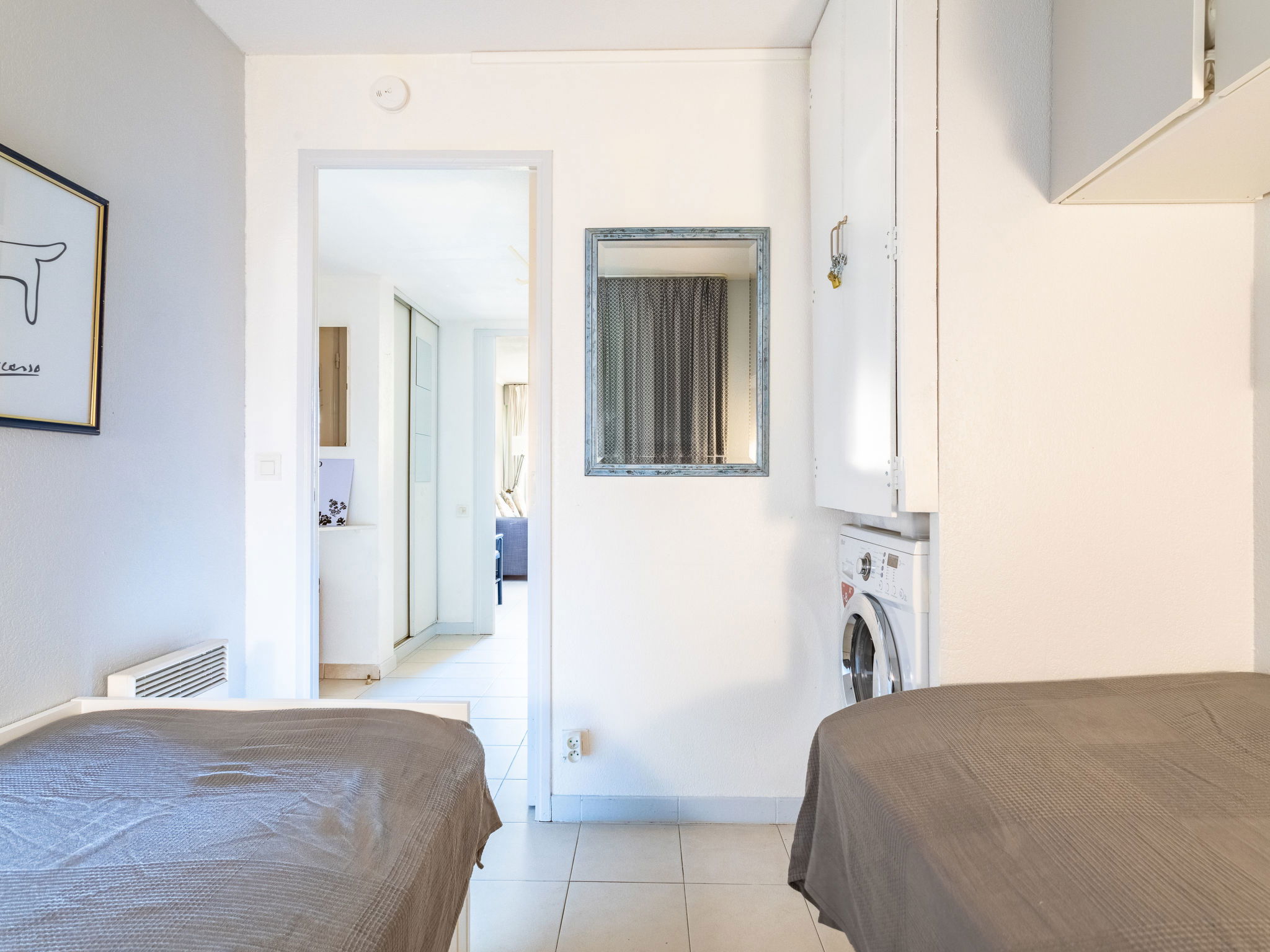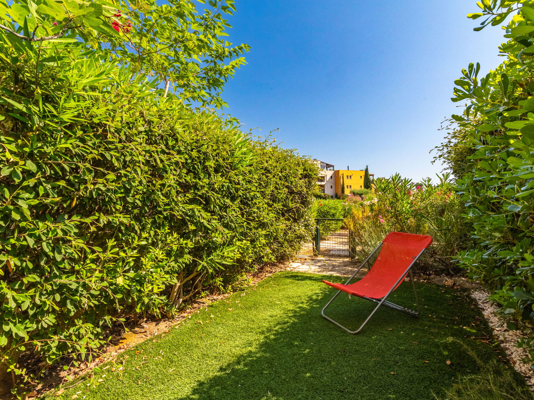 "Les Marines de Gassin 9", 2-room apartment 35 m2, on the ground floor. Simple and comfortable furnishings: living/dining room with 1 sofabed (140 cm, length 190 cm), TV (flat screen), air conditioning. Exit to the garden, to the terrace. 1 room with 2 beds (90 cm, length 190 cm). Kitchenette (4 hot plates, oven, dishwasher, toaster, kettle, electric coffee machine). Shower/WC. Electric heating. Terrace 15 m2, garden 9 m2. Terrace furniture, deck chairs (2). Facilities: washing machine. Internet (WiFi, extra). Parking space n 161. Please note: smoke alarm. 83065000152SO