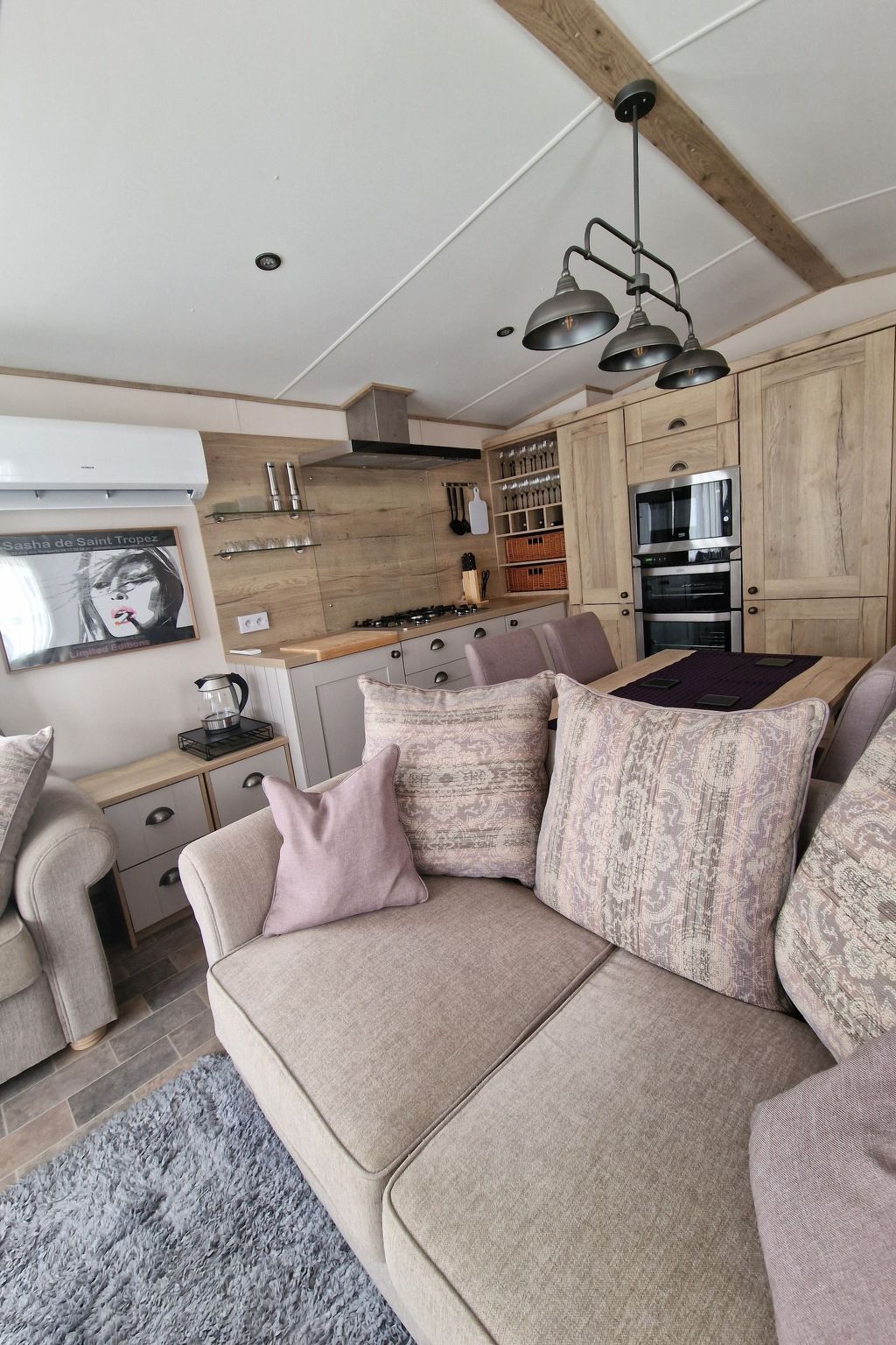 Inside, the mobile home has a kitchen that leaves nothing to be desired: you will find a gas hob, oven, fridge, freezer, microwave, Nespresso machine, toaster and kettle. Of course, there is a dishwasher for your convenience, leaving more time for relaxation. Comprehensive entertainment in the evening is provided by a TV with IPTV. The two bedrooms and two bathrooms ensure that everyone has their own space, which is particularly beneficial when on holiday with friends or family.