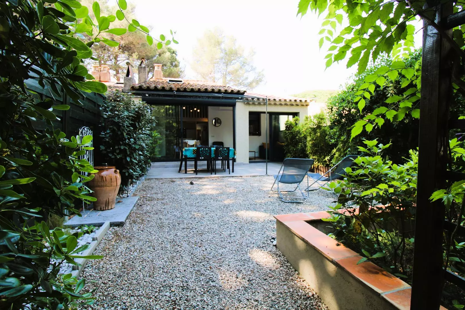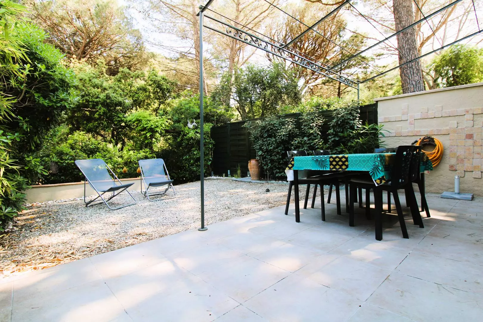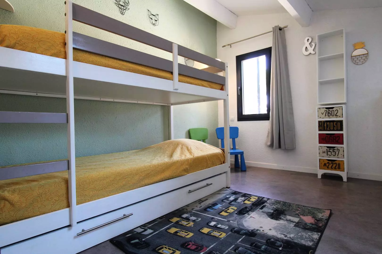 The mazet is composed of a living room with fully renovated kitchen area, a bedroom with a double bed, a mezzanine open to the living room with 2 bunk beds and a trundle bed, a renovated shower room with toilet, an enclosed veranda serving as a lounge, a terrace and a fully enclosed garden.