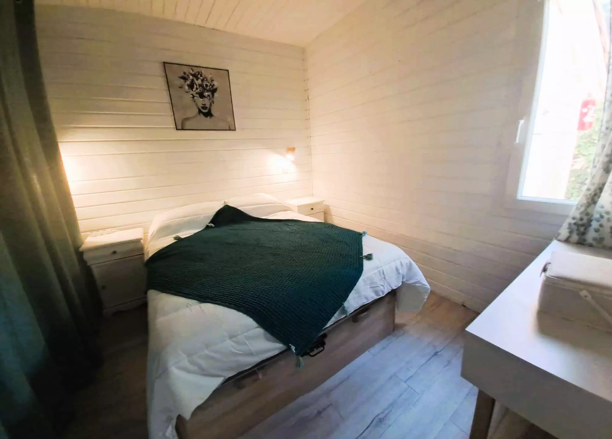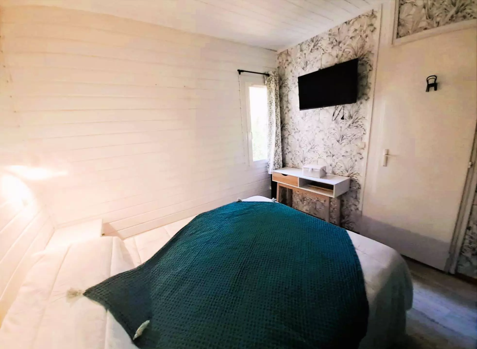 The bedroom is furnished with a 140cm double bed, a flat-screen TV and a dressing room.