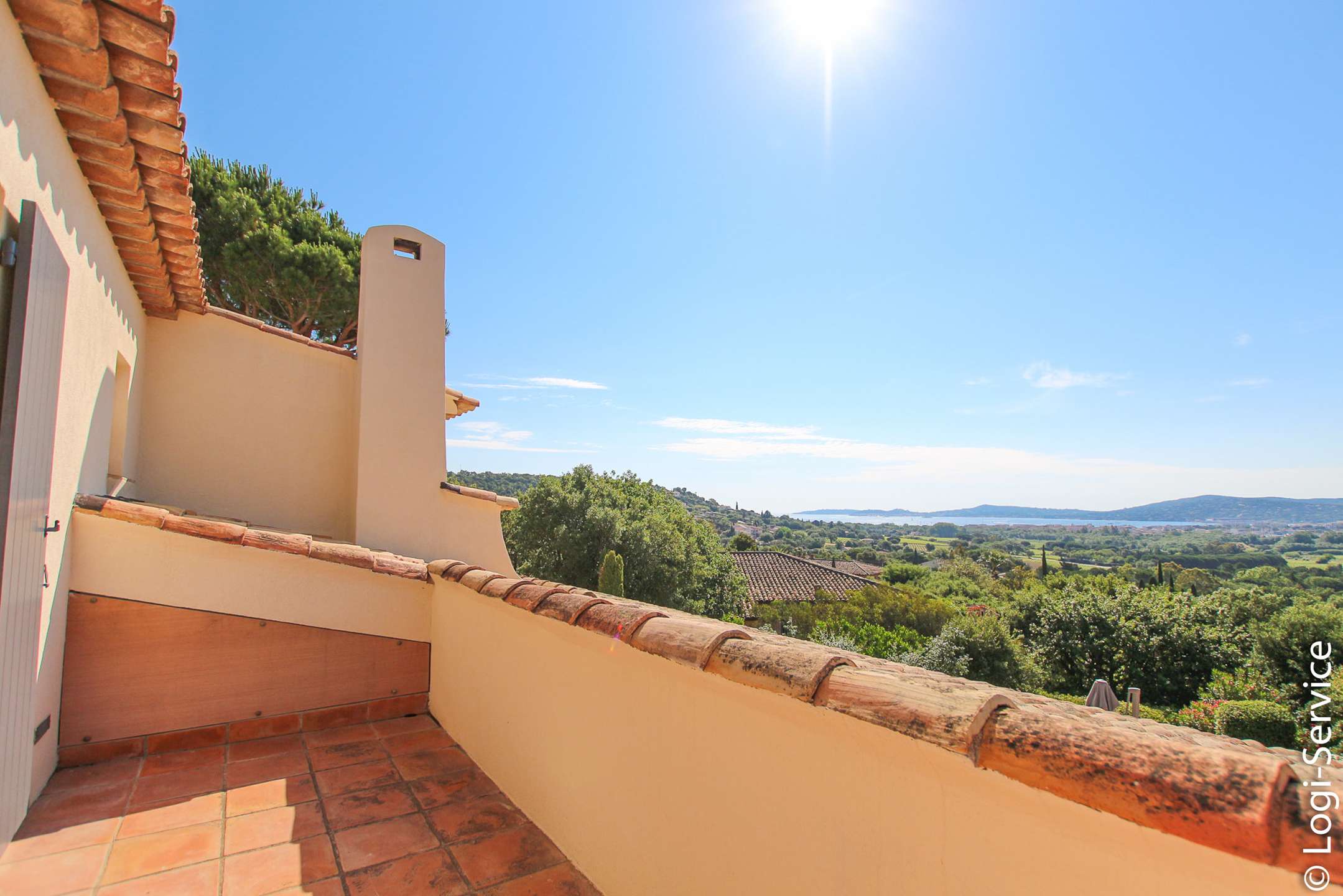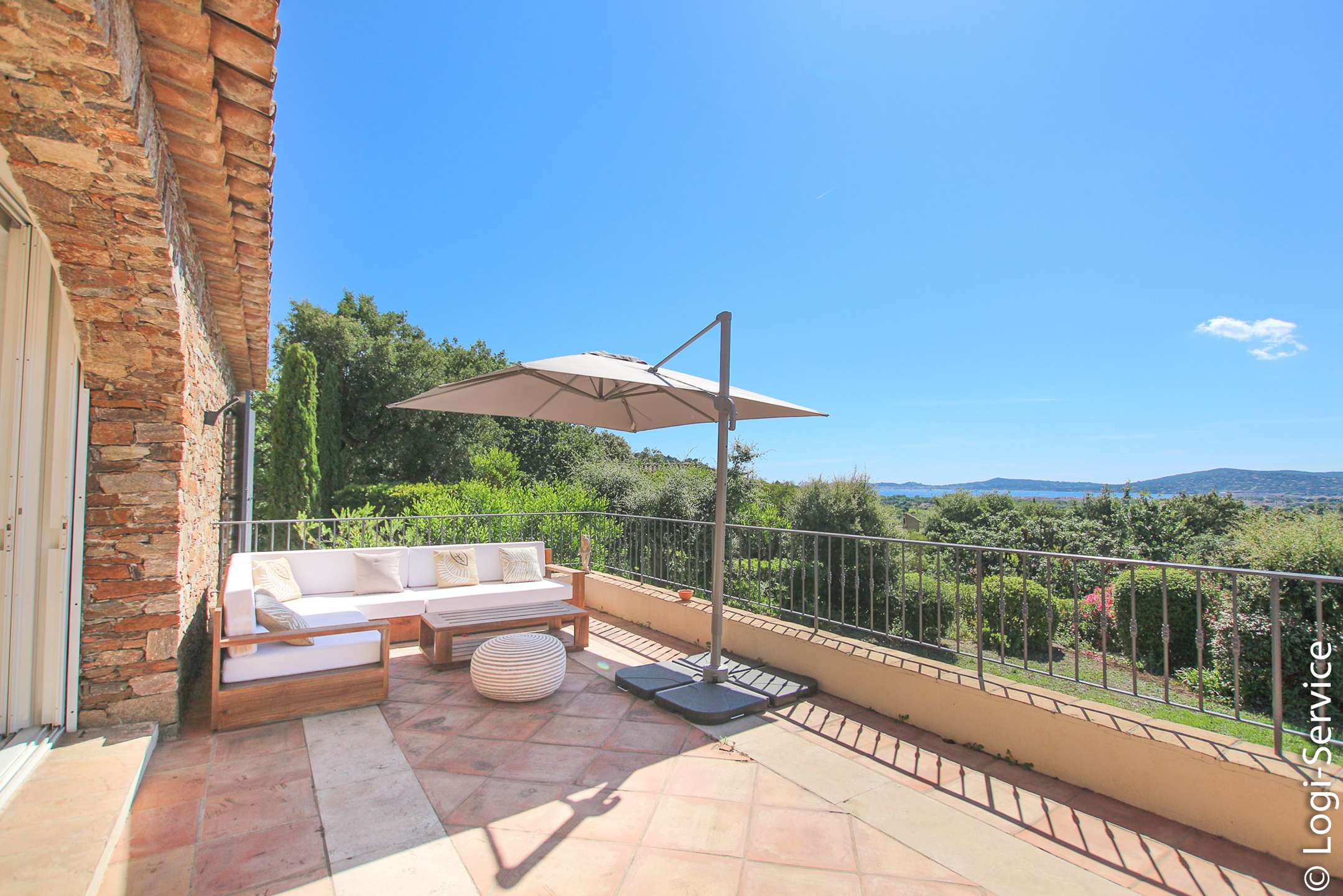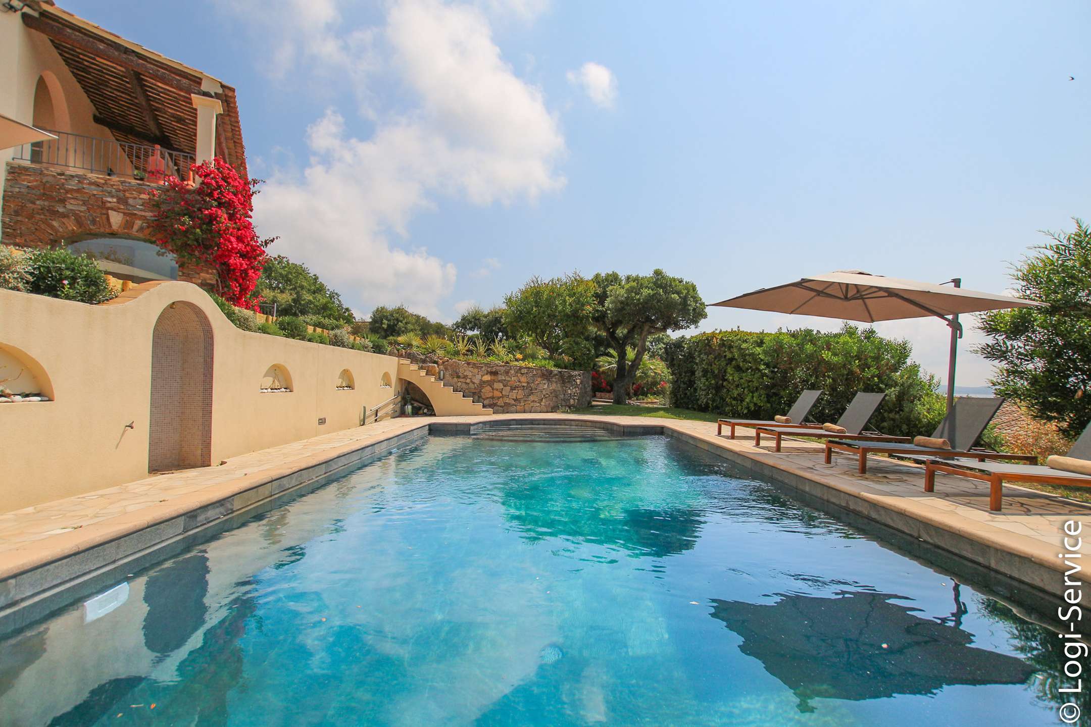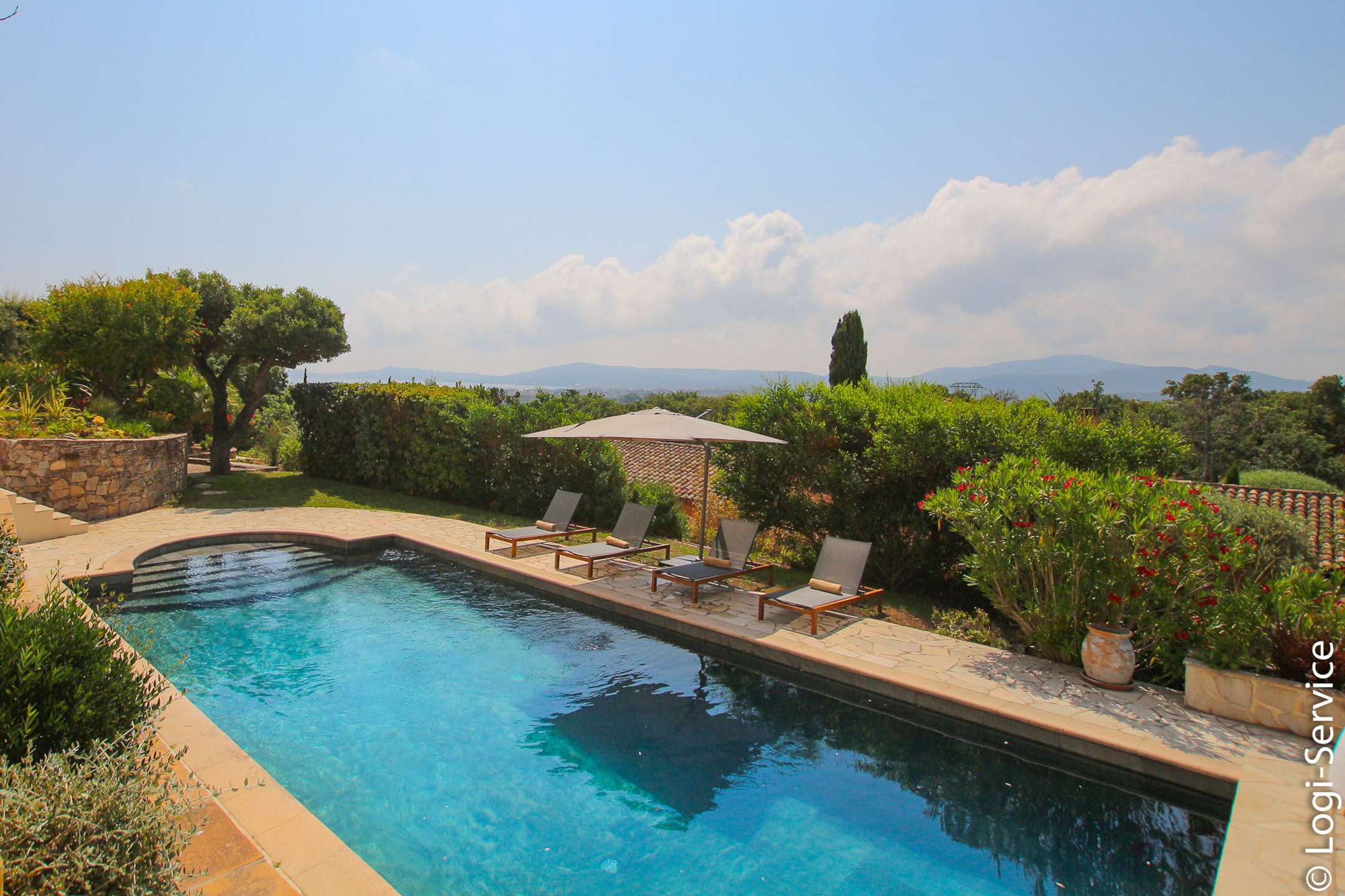 Ideally located, less than 4 km from Port Grimaud, 9 km from Sainte Maxime and 10 km from Saint Tropez, the Villa is fully air-conditioned and offers breathtaking sea and hill views, a large Bali stone swimming pool with counter current swimming and a petanque court.