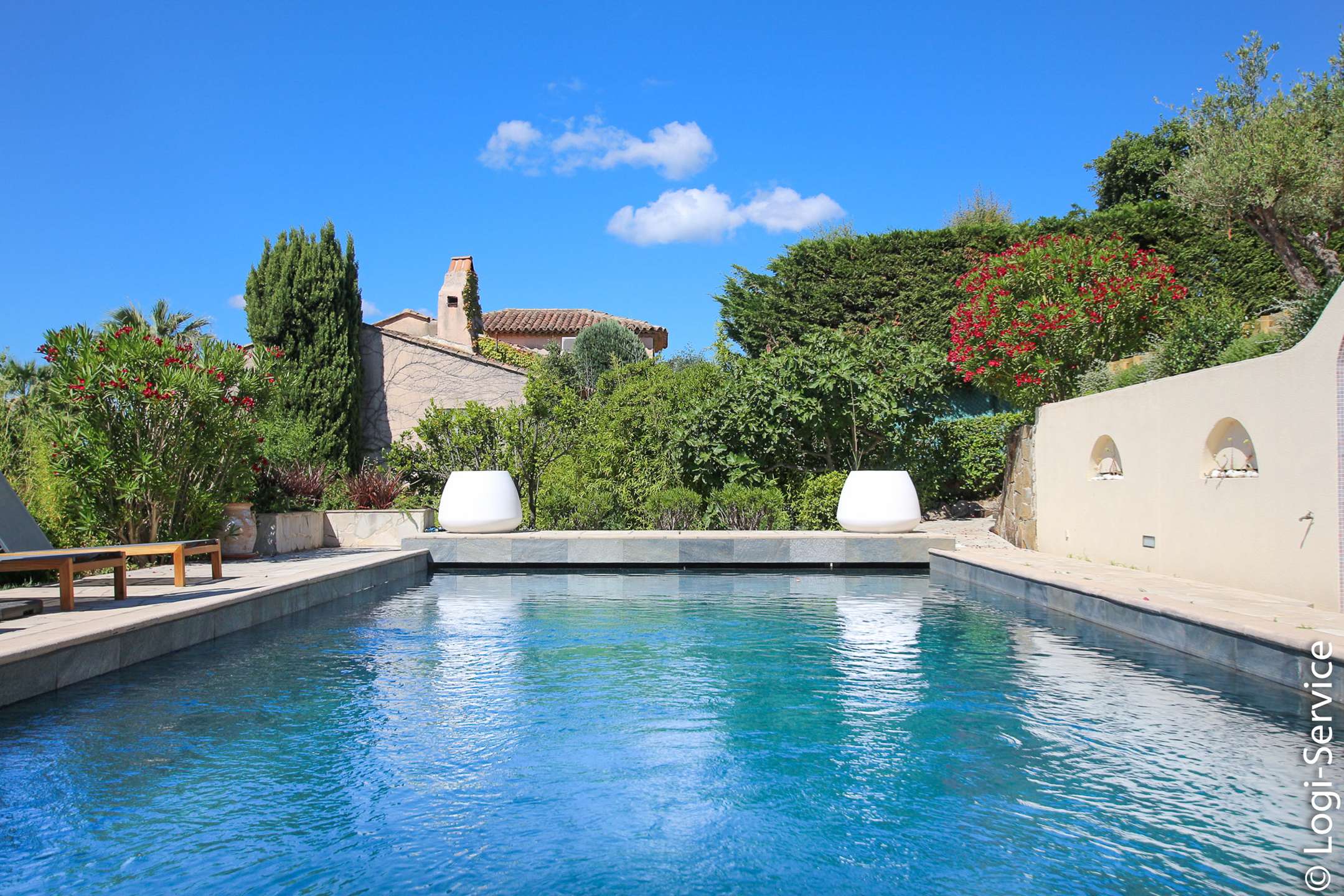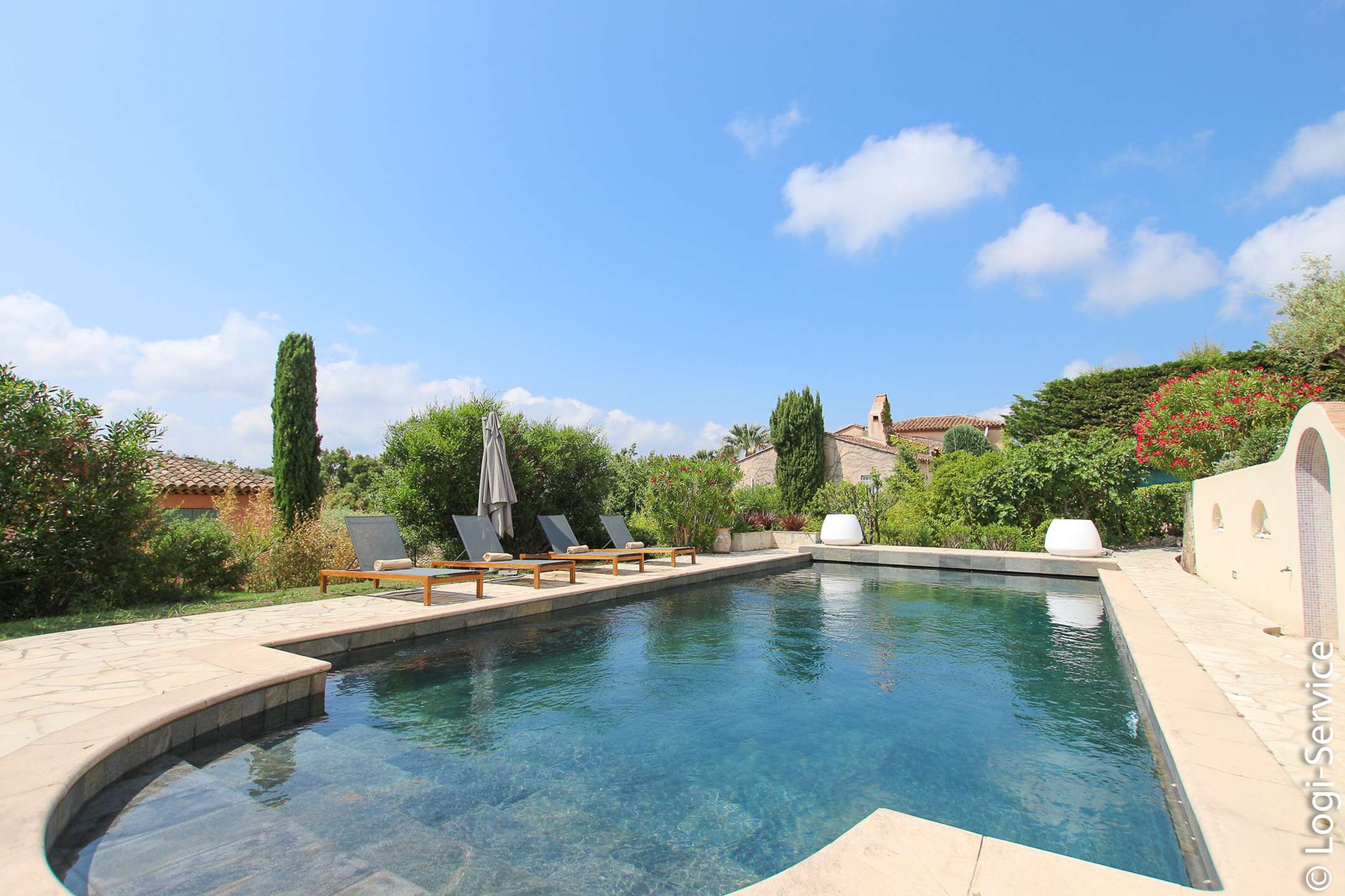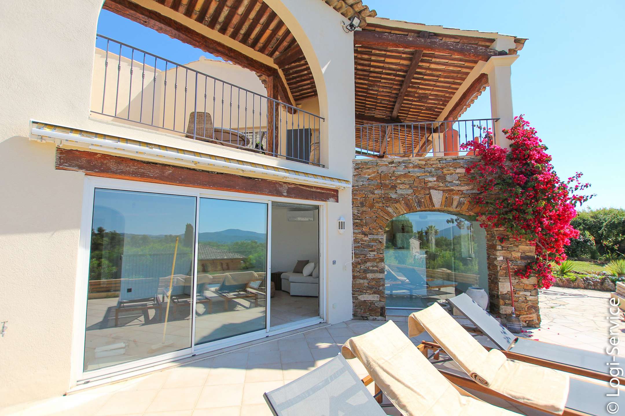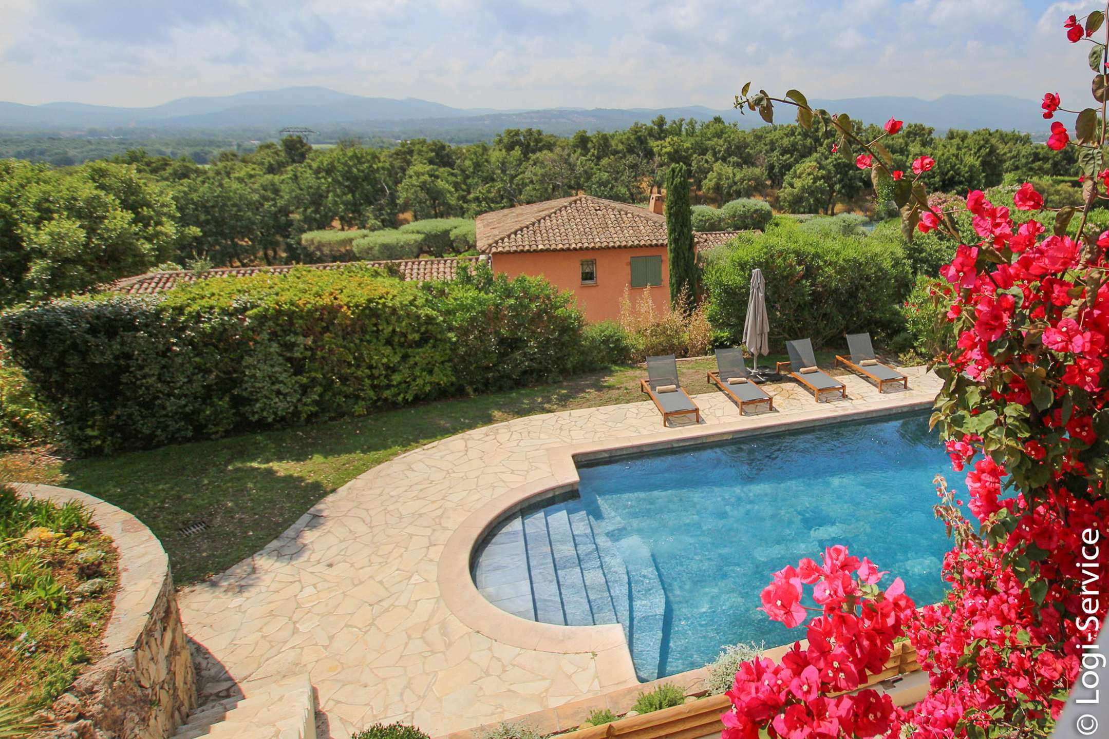 Ideally located, less than 4 km from Port Grimaud, 9 km from Sainte Maxime and 10 km from Saint Tropez, the Villa is fully air-conditioned and offers breathtaking sea and hill views, a large Bali stone swimming pool with counter current swimming and a petanque court.