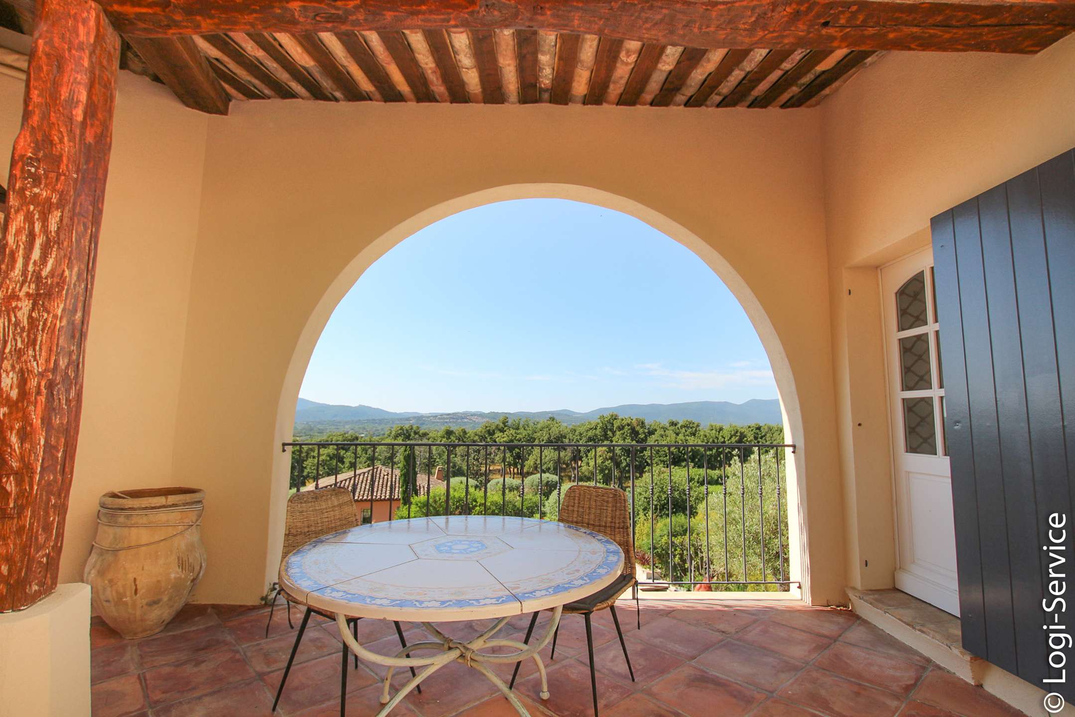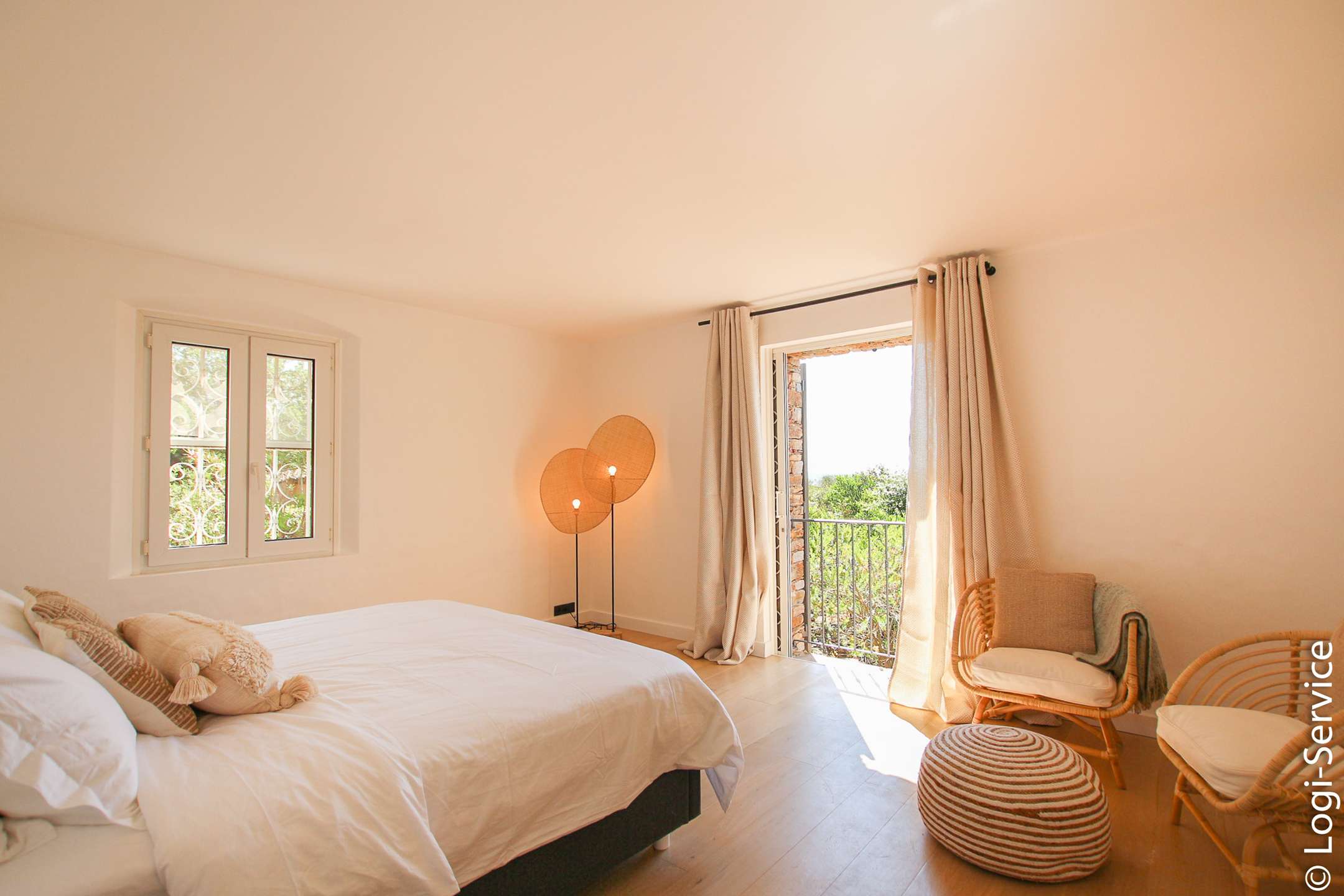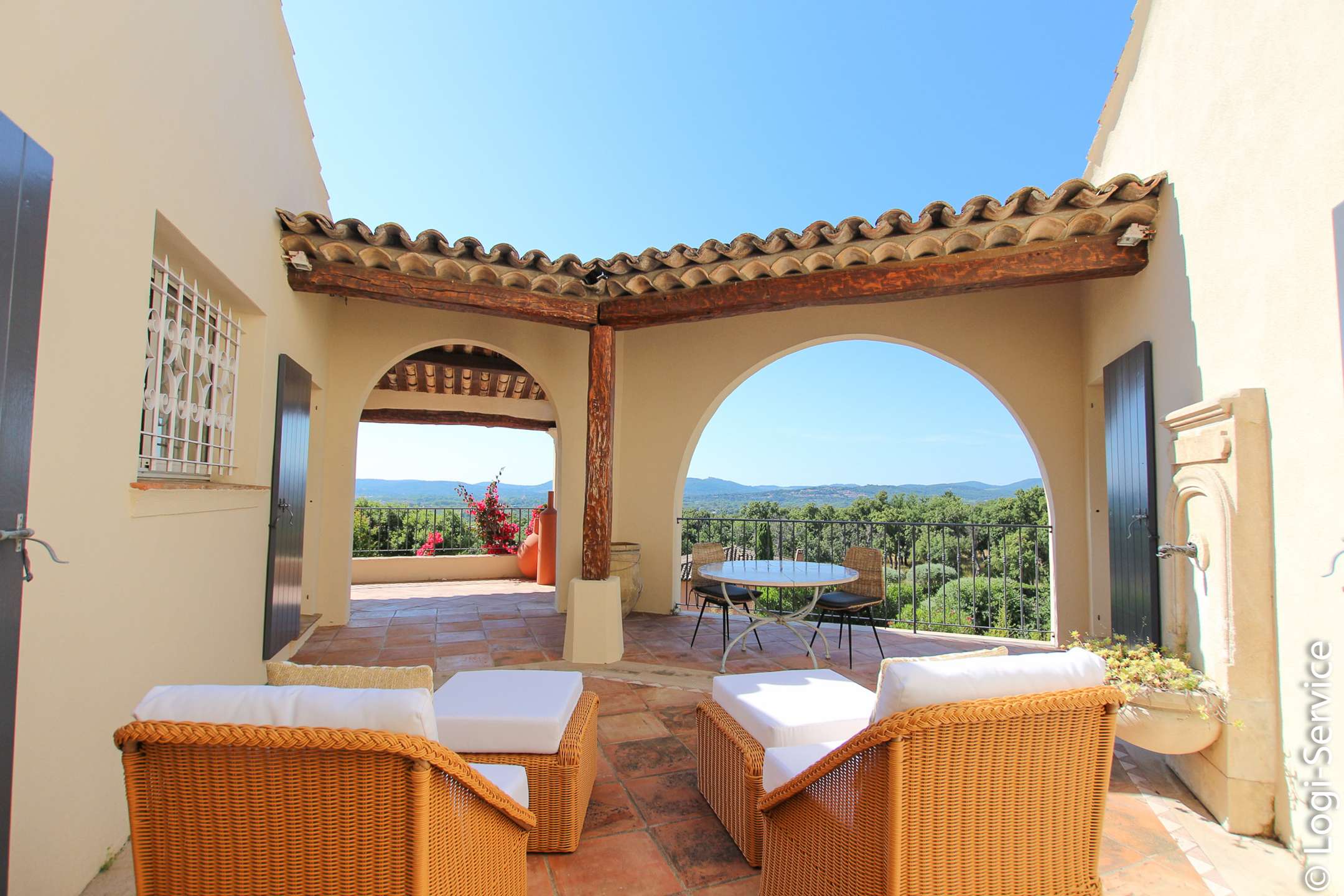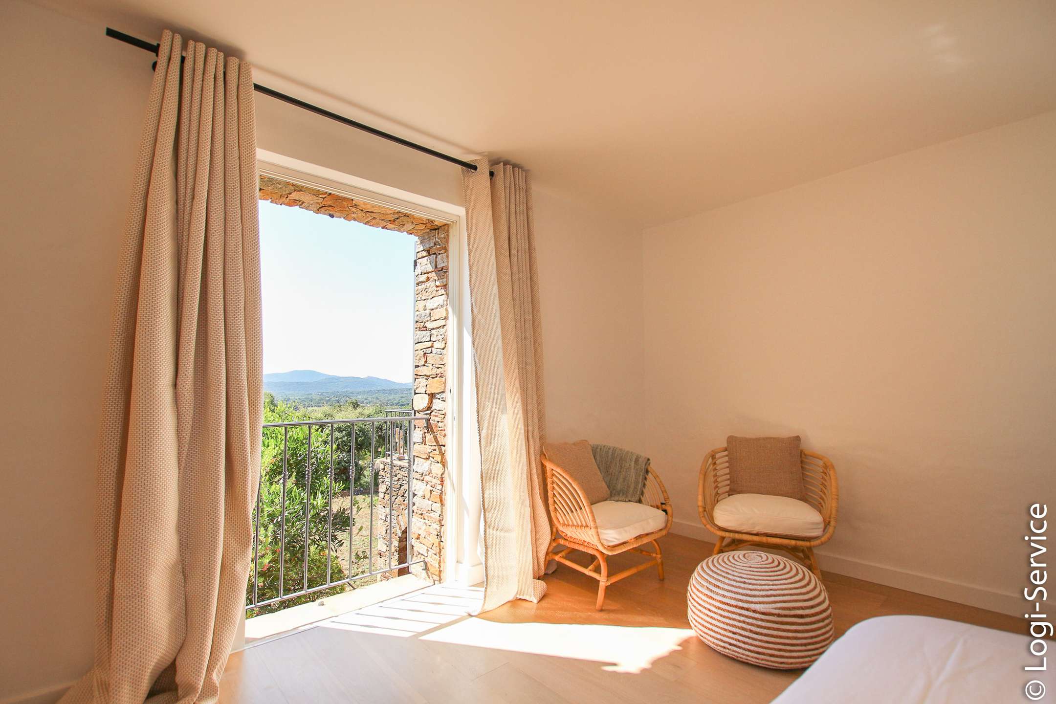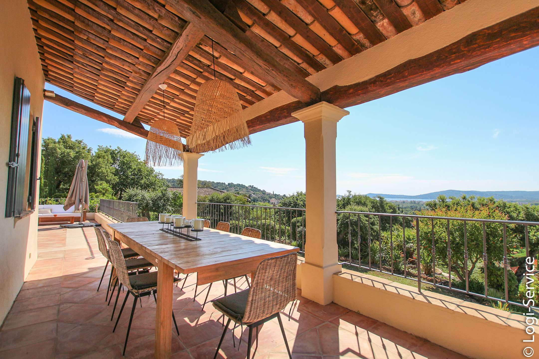 Ideally located, less than 4 km from Port Grimaud, 9 km from Sainte Maxime and 10 km from Saint Tropez, the Villa is fully air-conditioned and offers breathtaking sea and hill views, a large Bali stone swimming pool with counter current swimming and a petanque court.