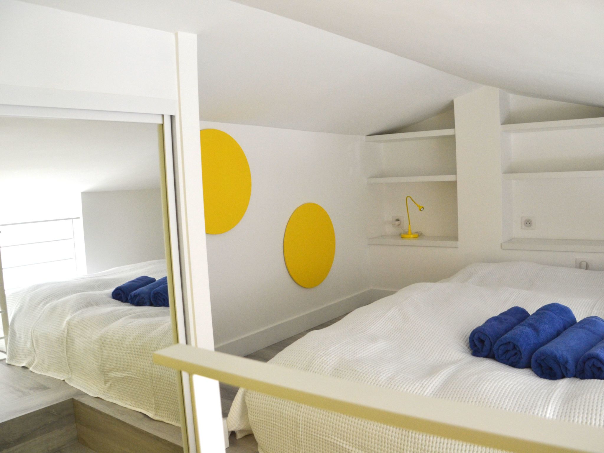 The holiday home leaves nothing to be desired. Guests can expect a cosy terraced house that has been renovated to the latest standards, is located directly on the waterfront, is fully equipped with air conditioning and has a private parking space. On the ground floor there is an open and generously equipped kitchen with induction hob, oven, microwave, dishwasher, coffee machine, toaster and kettle. There is a sociable dining area, a cosy living area with a double sofa bed and flat screen TV. There is also a guest WC. The 'Océan' bedroom is furnished with a double bed (160 cm), a large wardrobe, a chest of drawers and a workstation with an additional internet connection. There is also a private bathroom with washbasin, shower and WC. The 'Soleil' bedroom has a choice of a single bed (90 x 190 cm) or pull-out double bed (180 x 190 cm), a wardrobe and a newly inserted mezzanine, which offers a further two beds (each 90 x 200 cm) and an additional wardrobe. This bedroom also has its own bathroom with washbasin, shower and WC.